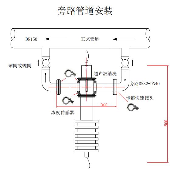 1:下图为在工艺管道DN38管道上安装在线浓度仪旁路安装。